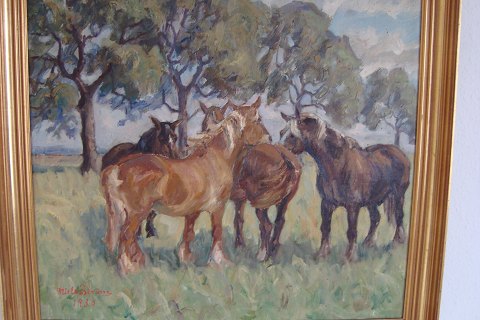 Niels Strøm (1881-1949): Heste på mark ved træer 1930. Olie på lærred. Sign.: Niels Strøm 1930 60x67 (69x77)
