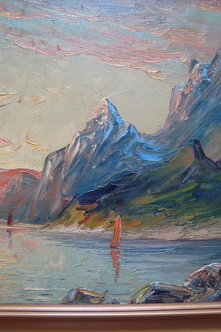 Gustav P. Rimmer (1904-88): Fjordparti med skibe og bjerge - solnedgang - antagelig Norge. Olie på lærred. Sign.: G.P. Rimmer. 32x47 (41x56)
