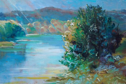 Christian B. Dybdal (20 årh): Åparti med gennembrydende sol. Fra perioden hvor Dybdal var inspireret af den franske impressionisme. Olie på plade. Sign.: CDybdal. 39x59 (52x72)