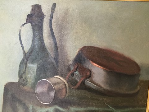 Witold Wisniewski (1921-77): Opstilling med kobbertøj på bord. Olie på lærred. Sign.: W. Wisniewski. Bagpå navn - Witold Wisniewski og Warszawa samt diverse stempler. 50x61 (61x72)
