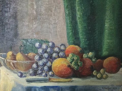 Edmund Fischer (1889-1952): Opstilling med frugter på bord 1920. Olie på lærred. Sign.: E. Fischer 1920 35x46 (49x60)