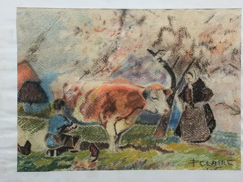 Auguste Jean Claire (1881-1970): Landskab med kvinde der malker ko 1945. Oliekridt på papir. Sign.: AJ Claire - 45. Fransk kunstner. Indrammet med lidt nusset passepartout. 39x49 (45x55)