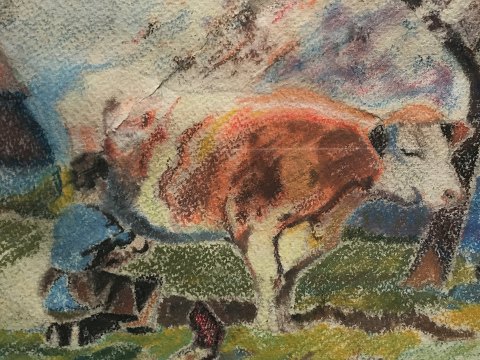 Auguste Jean Claire (1881-1970): Landskab med kvinde der malker ko 1945. Oliekridt på papir. Sign.: AJ Claire - 45. Fransk kunstner. Indrammet med lidt nusset passepartout. 39x49 (45x55)
