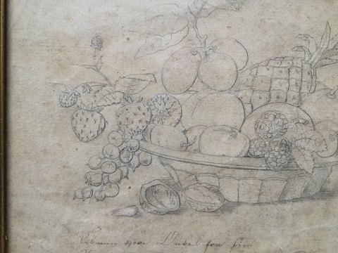 Andreas Fiebig (19 årh): Skål med frugter og nødder 1856. Bly på papir. Under tegning er der skrevet med pen - "Til min kjære Onkel - Juuleaften 1856 - Fra din Andreas Fiebig" 16x19 (18x21)
