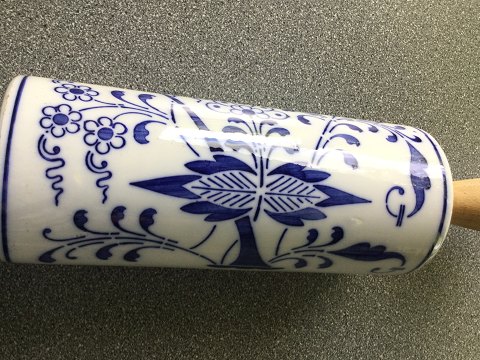 Løgmønsteret (Tyskland): Gammel kagerulle med drejede træhåndtag. Tyskland ca. 1880-1900. Uden stempel. Fajancerullen måler i længden 19 cm og hele rullen måler 40 cm.