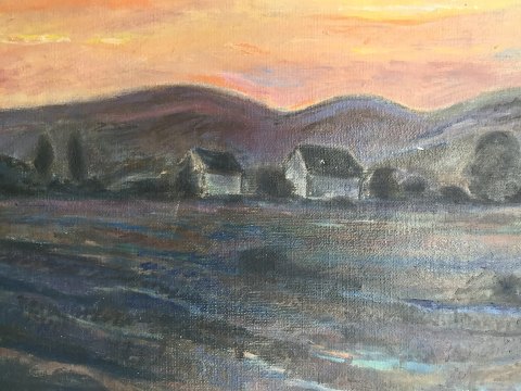 Bent Axel Oelsen (født 1941): Huse ved solnedgang 1977. Olie på lærred. Sign.: Bent Ax. Olesen Bagpå - Bent Ax. Olesen - Nov. 1977. Uden ramme. 54x65 Bent Axel Olesen er elev af Aage Sørensen 1976-81.