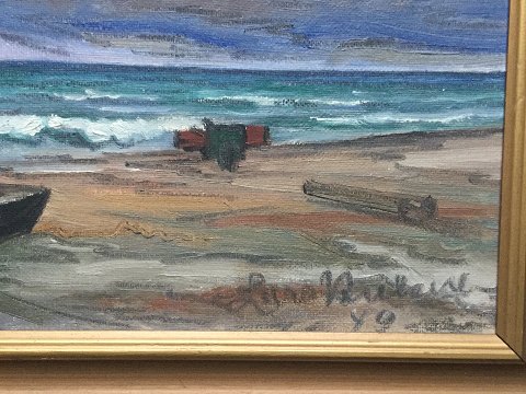 Lars Nielsen (1893-1965): Strandparti med både, Vestkysten 1949. Olie på lærred. Sign.: Lars Nielsen - 49. 33x46 (42x55)