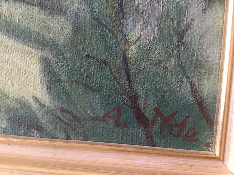A. Yde (20 årh): Landskab med sø. Olie på lærred. Sign.: A. Yde. Indrammet i nyere guldramme. 36x45 (45x54)