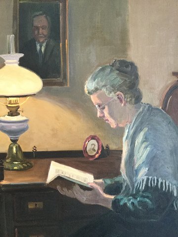 Kunstnerens hustru Christa Søndergaard læser i bog i lampens skær.