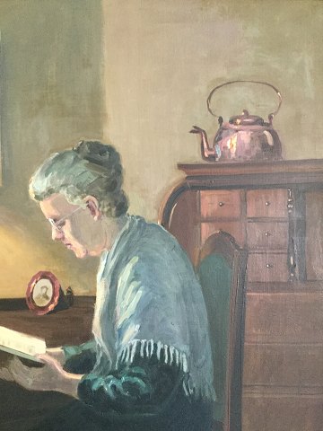 Kunstnerens hustru Christa Søndergaard læser i bog i lampens skær.