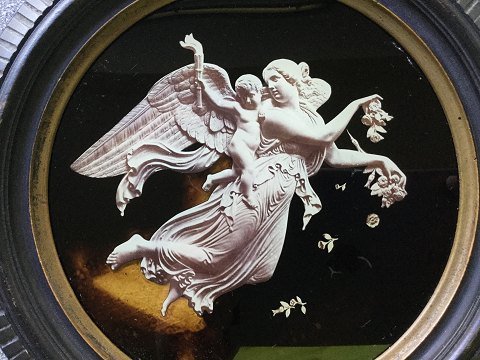 Rund egetræsramme med tandsnit. Thorvaldsen motiv. Hinterglas maleri/fotomontage. År ca. 1890. Mål med ramme - diameter 29 cm.