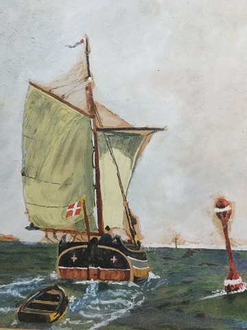 Ubekendt kunstner (20 årh): Marstal Jagten stævner ud 1944. Gouache/pastel på papir. Sign.: EH 26-10-44. 24x22 (34x31)