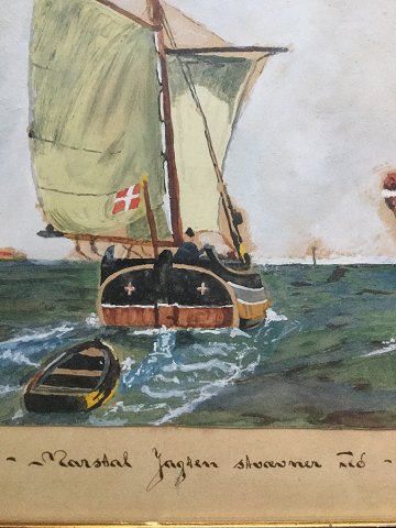 Ubekendt kunstner (20 årh): Marstal Jagten stævner ud 1944. Gouache/pastel på papir. Sign.: EH 26-10-44. 24x22 (34x31)