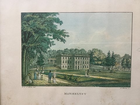 H.G.F. Holm (1803-61): Marienlyst Slot. Tryk efter kobberstik af Jens Holm efter tegning af H.G.F. Holm. Fugtpletter forneden. Indrammet i pæn sølvramme - 21x25.