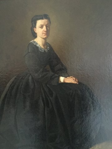 Ubekendt kunstner (19 årh): Helfigursportræt af kvinde i sort lang kjole. Olie på lærred. Ny blindramme og lærredet dubleret i 1981. Sign.: Usigneret 54x45 (64x54)