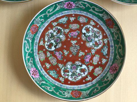 3 kinesiske tallerkner. Dekoreret med blomster på rustrød fond og grøn fane. Ingen stempler. Lavet med huller bagpå til ophæng. Diameter - 21½ cm.