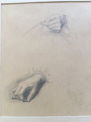 Portrætter og helfigur af soldaterkammerater fra krigen i 1864 samt et studie af kvindehænder.