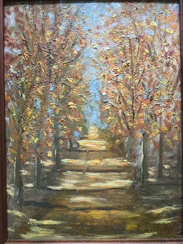 Ubekendt kunstner (20 årh): Allé i efterårsfarver. Olie på plade. Sign.: E. Lach.... 25x19 (32x25)