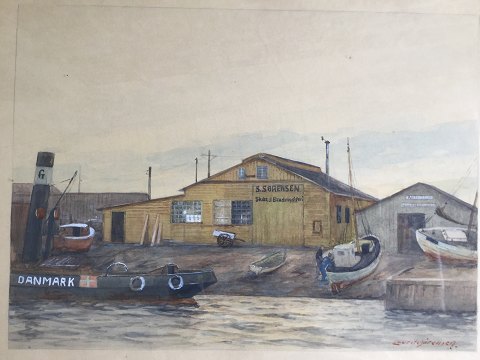 Lauritz Sørensen (1882-1952): Havneparti med "S. Sørensen Skibs & Baadebyggeri". Akvarel på papir. Sign.: Lauritz Sørensen 26x36 (41x50)