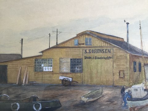 Havneparti med "S. Sørensen Skibs & Baadebyggeri".