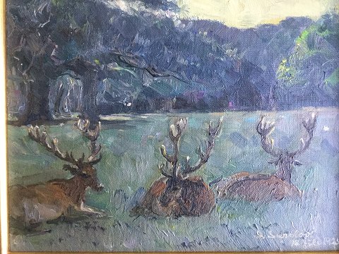 Hvilende kronhjorte ved skov 1925.