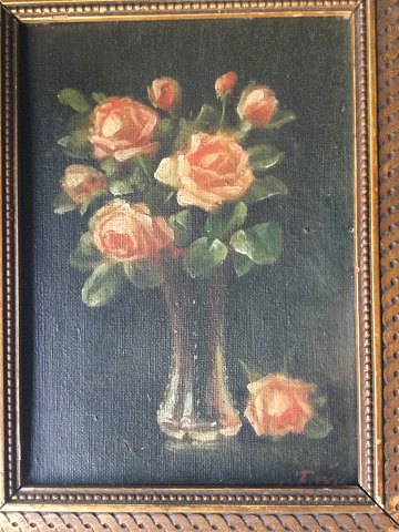 C.F. Madsen (død 1929): Lyserøde roser i vase. Olie på lærred monteret på pap. Smuk samtidig guldramme med "Løbende hund" frise. Sign.: CFM 20x14½ (23½x18)