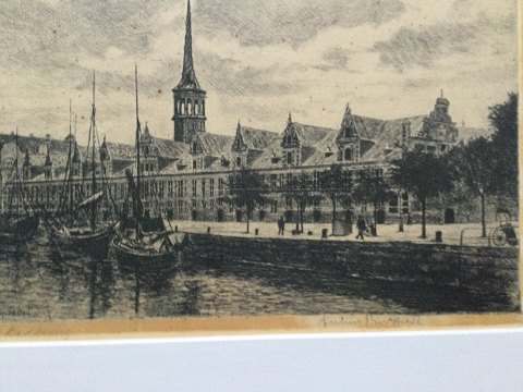 Julius Borchert (1878-1949): Børsen i København. Radering på papir. Enkelte pletter. Sign.: Julius Borchert (bly) samt i trykket: JBorchert. Nyere indramning med lækker passepartout. 18x25 (34x40)