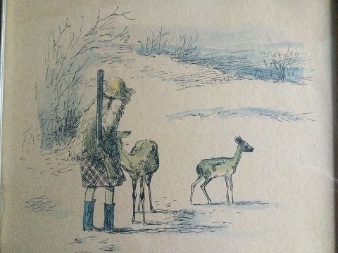 Ubekendt kunstner (20 årh): Jæger og dådyr i sneen. Offset tryk efter tegning. Usigneret. Indrammet 24x29