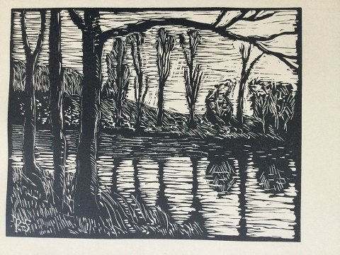 Poul Sørensen (1931-2018): Landskaber: I - Skovsø. II - Vej til bondegård Træsnit på papir. Sign.: PS i trykket 35x44 (36x45) Poul Sørensen er uddannet fra Teknisk Skole i Frederikshavn.