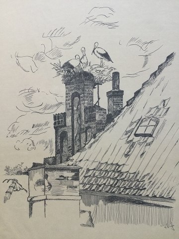 Ubekendt kunstner (20 årh): Storkerede på tag. Litografisk tryk på papir. Sign.: monogam i trykket (se foto). Indrammet 49x39.
