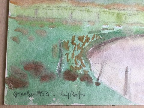 Leif Rafn (1909-82): Vue ind over Gravlev By 1953. Akvarel på papir. Sign.: Leif Rafn. Betegnet - Gravlev 1953. Uden ramme. 26x38
