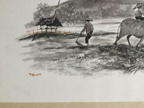 Ubekendt indonesisk kunstner (20 årh): Indonesiske markarbejdere. Tusch/bly på papir. Sign.: U...?? 27x37 (39x49)