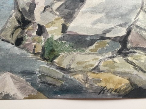 Ubekendt kunstner (20 årh): Kystparti ved Svaneke, Bornholm 1962 Akvarel på papir monteret på pap. Sign.: JR 1962 Betegnet - Svaneke Uden ramme 35x49 - med pap 45x60