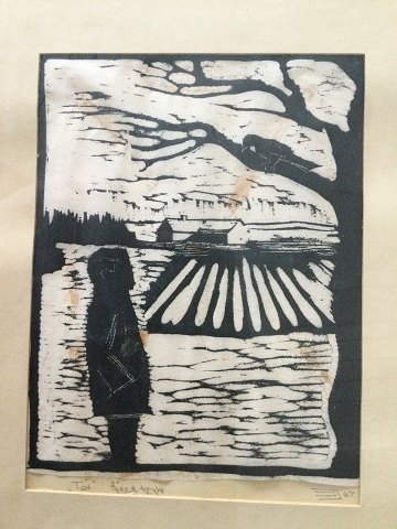 Ubekendt kunstner (20 årh): Person i vinterlandskab 1967 "Tø". Træsnit på japanpapir. Enkelte pletter. Sign.: Monogram 67. Betegnet "Tø" samt Eget tryk. 17x13 (35x24)