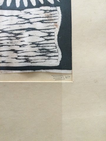 Ubekendt kunstner (20 årh): Person i vinterlandskab 1967 "Tø". Træsnit på japanpapir. Enkelte pletter. Sign.: Monogram 67. Betegnet "Tø" samt Eget tryk. 17x13 (35x24)