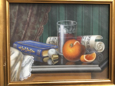 Opstilling på stenkarm med noder, bog, glas og appelsiner 1872.