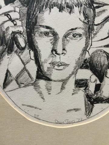 Anne Torp (20 årh): Kvinde og 2 klovne 1977. Radering på papir monteret i ovalt passepartout. Sign.: Anne Torp 77. Eget tryk Uden ramme Mål inkl. passepartout 34x21