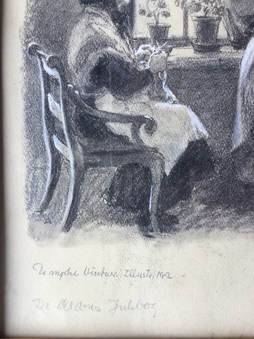 Axel Andreasen (1878-1953): 2 kvinder ved vindue. Illustration til "De Mørke Vinduer" Kridt og hvidt på papir. Sign.: A Betegnet Illustr. nr 2 - De Ældres Julebog. Indrammet 30x25