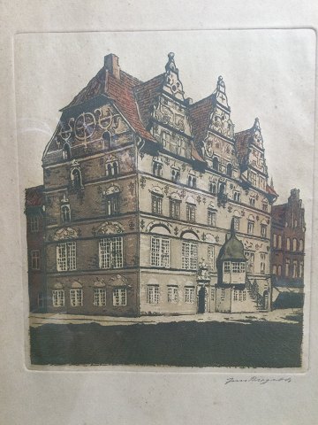 Jens Dragsbo (1886-1954): Jens Bangs Stenhus, Østeraa, Aalborg. Farveradering på papir. Sign.: Jens Dragsbo (bly) Indrammet i smuk guldramme. Trykfladen måler 25x22 Indrammet - 43x35