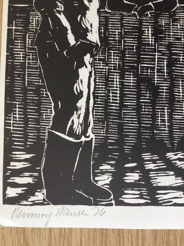 Henning Hansen (20 årh): 2 arbejdsmænd i samtale 1976. Linoleumssnit på papir. Uden ramme. Sign.: Henning Hansen 76. 30x21