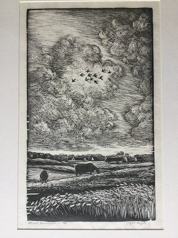 Knud Hansen (født 1934): Køer på mark 1976. Træsnit på papir. Sign.: Knud Hansen - 76. Eget tryk. 30x19 (43x31)