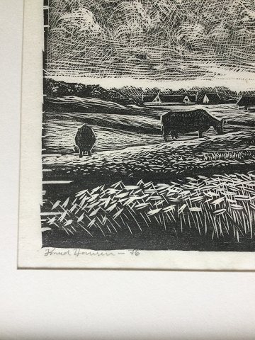 Knud Hansen (født 1934): Køer på mark 1976. Træsnit på papir. Sign.: Knud Hansen - 76. Eget tryk. 30x19 (43x31)