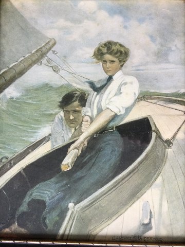 Clarence F. Underwood (1871-1921): Ungt par i båd "Skipper & Mate". Offset tryk på papir. Sign.: Clarence F. Underwood (i trykket). Indrammet 46x39