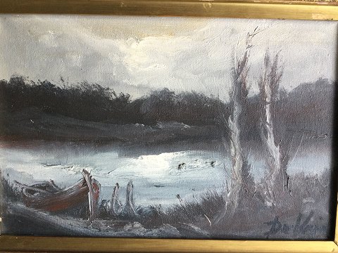 Brith de Vries (født 1941): Aftenstemning ved Madum Sø, Rold Skov. Olie på lærred. Sign.: De Vries Bagpå lærred - de Vries - Madum Sø. 22x33 (25x36) Brith de Vries er født Birgitta Kyhn.