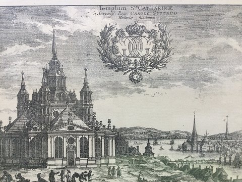 Ubekendt kunstner (20 årh): Parti fra Stockholm ca 1700. Senere grafisk tryk efter kobberstik af Erich Dahlbergh (1625-1703). Indrammet 26x39 nr. 130