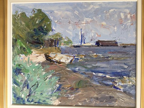 Børge Bokkenheuser (1910-76): Kystparti med båd på strand. Olie på lærred. Sign.: Bokkenheuser 51x61 (69x79)
