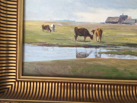 Niels Christiansen (1873-1960): Køer og kvier på engen. Olie på lærred. Sign.: N.Chr. 32x47 (44x59) Niels Christiansen var uddannet fra Teknisk skole.