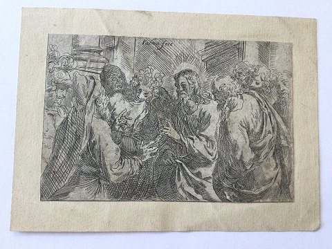 Jacopo Palma den Yngre (1544-1628): Kristus og Kvinden taget i ægteskabsbrud 1611. Kobberstik på papir monteret på pap. Sign.: Palma Fec Uden ramme Bladet måler 11x16½ (15x20) 27121