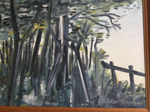 Svend Sørensen (født 1948): Landskab med stakit 1964. Olie på lærred. Sign.: Svend Sørensen - 64. Bagpå - Svend Sørensen 1964 Silkeborg. 60x80 (68x90)