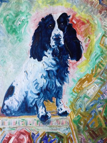 Hans Jørgen Korn (1888-1963): Siddende hund i interiør 1955 - antagelig en "Kleiner Münsterländer." Olie på lærred. Sign.: Korn - 55 66x46 (68x48) Et meget smuk og veludført maleri.